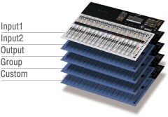 K dispozici jsou dvě INPUT banky, jedna OUTPUT banka a GROUP banka, kterou lze vybrat stiskem obou tlačítek INPUT bank najednou. Banka GROUP umožňuje ovládat úrovně více kanálů pomocí jednoho DCA faderu. Je zde také uživatelská CUSTOM fader banka, ve které si můžete přiřadit libovolný vstup, výstup, DCA skupinu k libovolnému faderu.