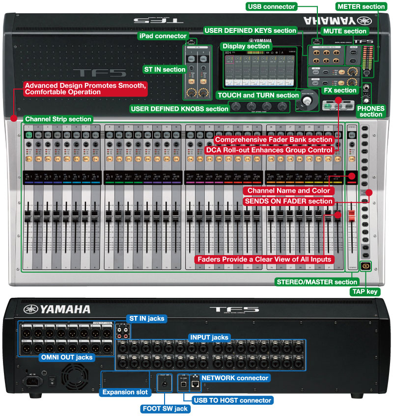 TF5 lze používat pro mix velkých kapel, protože je vybaven 32 vstupními kanály. Je zde také 16 výstupních kanálů, které lze libovolně přiřadit k 14 odposlechovým výstupům, pokud se 2 kanály použijí pro hlavní výstup. TF5 lze použít jak pro mix z pódia (stage mixing), tak i pro mix odposlechů (monitor mixing).
