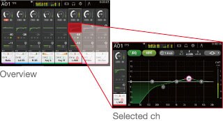 Stejně jako u konzolí CL série, i zde je ovládání založeno na oknech Overwiev a Selected Channel. Displej Overwiev zobrazuje parametry pro osm kanálů najednou, zatímco ovladač Touch & Turn nabízí přímý přístup k nastavení zisku (Gain), 1-knob EQ™, 1-knob COMP™, prahu brány (gate threshold), úrovně odesílaného efektu, panoramy a dalších parametrů. Klikněte na vybraný parametr dvakrát a přepnete se na displej vybraného kanálu (Selected Channel), kde máte k dispozici přístup k podrobným parametrům pro jemnější nastavení.