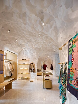 The Maison occupies three floors within the red brick walls of a traditional French-style building in Xintiandi, a bustling commercial district of Shanghai. The space, covering a floor area of 1,542 square meters, was designed by internationally renowned architect Kengo Kuma. Kuma’s design successfully blends the artistic sophistication of the brand with a classical century-old structure. The overall result is a contemporary environment that effectively supports multiple functions. It is a place where visitors can discover new creations in furniture, tea ware, study goods, clothing, and jewelry, all infused with Shangxia elegance achieved through the application of top-quality materials and innovative design.