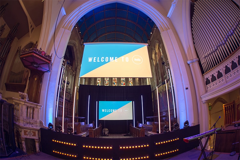 HTB has four sites in London, its Brompton Road complex being close to popular destinations like the Science, Natural History and V&A museums. Here the church has a primary worship space, as well as a number of smaller ‘breakout’ rooms where meetings and other events can be held. These are located several hundred metres from the main building.