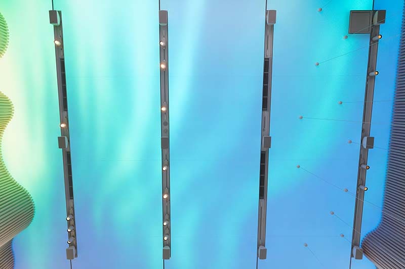 The Volvo plan specified electrical fixtures, lights, ducts, speakers, and anything else to be hidden in the grooves they referred to as the “Cove,” in order not to block the ceiling display panel. But the speakers from a different manufacturer that had been originally specified by Volvo did not fit in the Coves when they were laid out with emergency equipment required by Japanese fire law. At that point discussions with the Volvo head office let to the adoption of Yamaha VXS5W speakers.