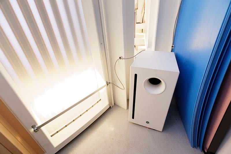 A total of 21 Yamaha VXS5W speakers are installed in the ceiling, assigned to three zones: entrance, a row in front of the video monitor, and the rear area. This allows optimum volume to be set for each zone. The speakers in front of the large monitor deliver sound for video content shown, while the others handle background music. Two VXS10SW subwoofers are also installed in locations that are not visible to guests. Five VXC4W ceiling speakers are installed in the office and restroom.