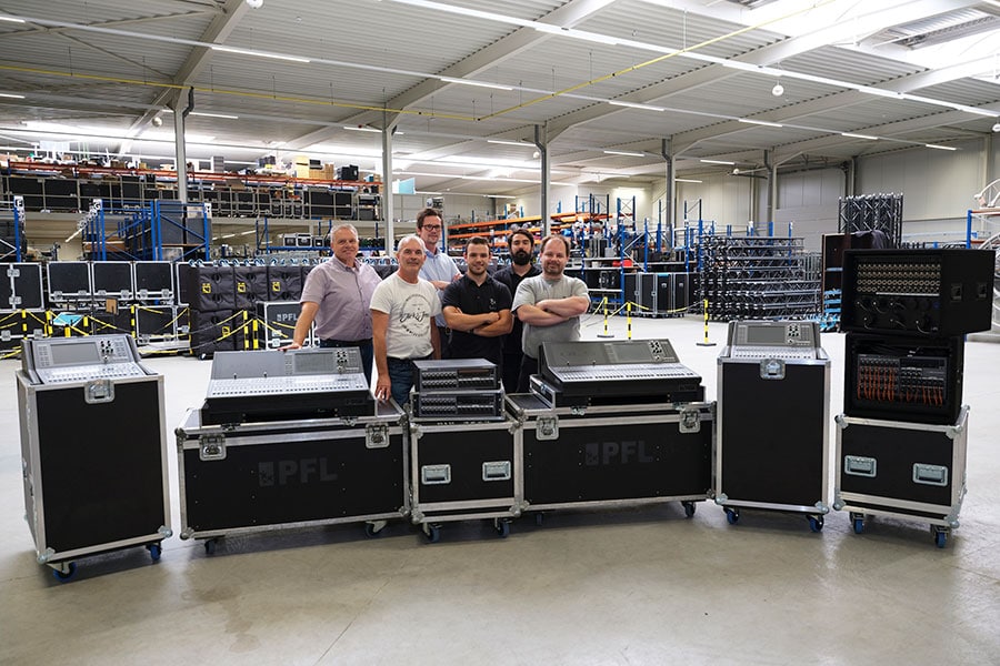 Dominic de Gruyter, Owner and CEO of PFL (left) with other audio staff and the new Yamaha equipment