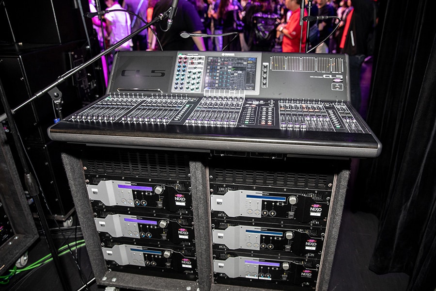 A Yamaha RIVAGE PM10 was selected for FOH, with a CL5 digital mixer on monitors and a QL1 providing a main system feed. The entire system is connected to microphone inputs on stage via RiO3224-D2 I/O racks to the Dante network through dual Yamaha RPio222 I/O rack units and dual SWP1-16MMF L2 network switches. All inputs split to monitor and FOH system, ensuring both full and independent controls for house and monitor engineers. As for FOH system, the RIVAGE PM10 and NEXO NXAMPs are connected via Dante with redundancy with three dual SWP2-10MMF L2 switches.