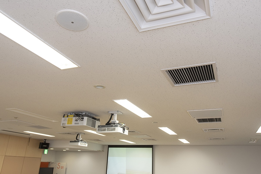 Ms. Kitano: We arrive at the number of units required not from the number of students in a classroom, but in light of the range for picking up voices using the ceiling microphones. Since both classrooms are quite large and frequently students are encouraged to engage in discussions and group work as well as to listen to lectures, we thought it will be essential to be able to collect sound properly from every corner of the room.