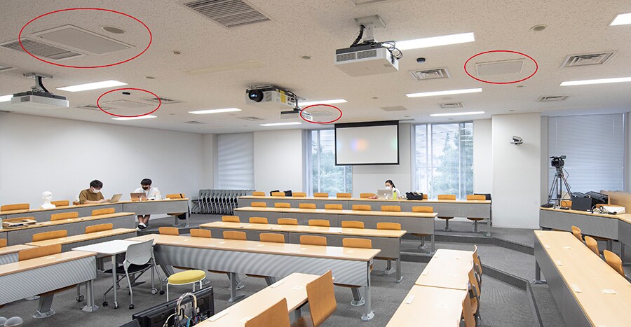 Dr. Sunahara: The large classroom (C3S02) in which we installed six RM-CGs can hold up to 100 people before the coronavirus pandemic hit. Today, we try to keep the number of students down to around 40 to maintain social distancing in light of the coronavirus pandemic. The lecture theater (C3S01) is where we installed four other RM-CGs. Before the coronavirus pandemic, this classroom held 60 people, but since the coronavirus pandemic, we keep the number of students down to around 30.