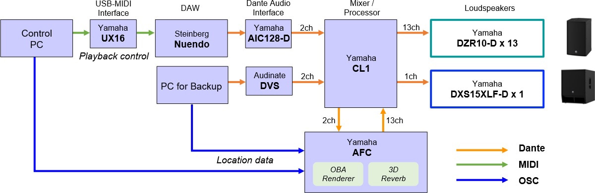 Celý systém reprodukce zvuku byl zapojen do sítě Dante a používal DAW Steinberg Nuendo pro směrování zvuku z počítače s kartou AIC-128D Dante Accelerator do digitálního mixážního pultu Yamaha CL1 a procesoru AFC a poté do jednotlivých reproduktorů.