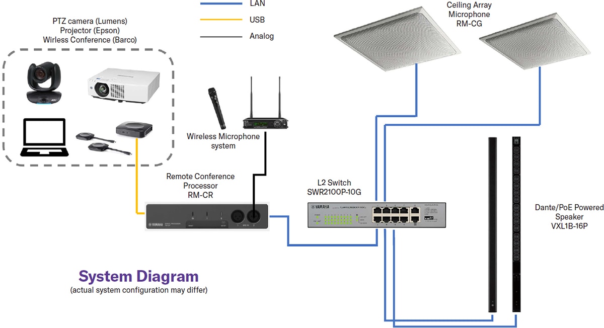 Všechna zařízení ADECIA v každém systému byla připojena k síťovému přepínači Yamaha SWR2100P-5G L2, který směroval napájení přes síť Ethernet (PoE) i zvuk po jediném kabelu Cat 6.