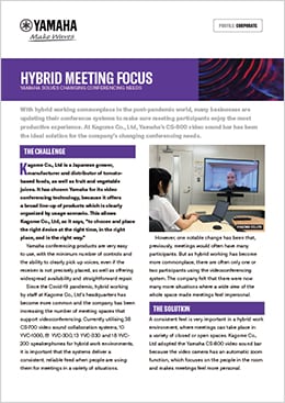Vzhledem k tomu, že hybridní práce je v post-pandemickém světě běžná, mnoho podniků aktualizuje své konferenční systémy, aby účastníkům schůzek a porad zajistily co nejproduktivnější zážitek. Ve společnosti Kagome Co., Ltd. je video soundbar CS-800 od společnosti Yamaha dokonalým řešením pro měnící se konferenční potřeby společnosti.