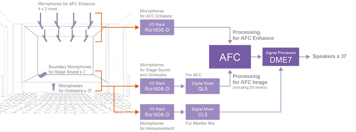 Do orchestřiště bylo umístěno 37 mikrofonů, plus sedm mezních mikrofonů na jevišti. Vstupy byly směrovány přes I/O racky Rio3224-D a Rio1608-D do digitálního mixu Yamaha QL5 pro vyvážení, než byly odeslány do procesoru AFC Image. Výstupní signály pro AFC Enhance a AFC Image, spolu se zdroji mimo AFC, jako je konferenciér, byly směrovány a ekvalizovány pomocí signálového procesoru Yamaha DME7 a poslány do výkonových zesilovačů pro reproduktory do hlediště.