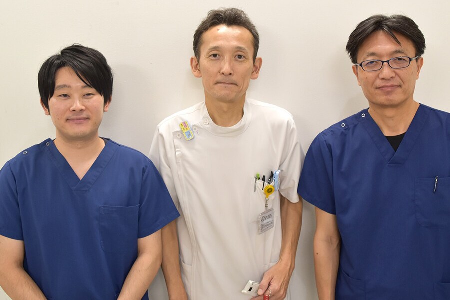 Pan Narumi Sato, pan Masaki Yoda a pan Arata Nagahama z centrálního radiologického oddělení nemocnice.