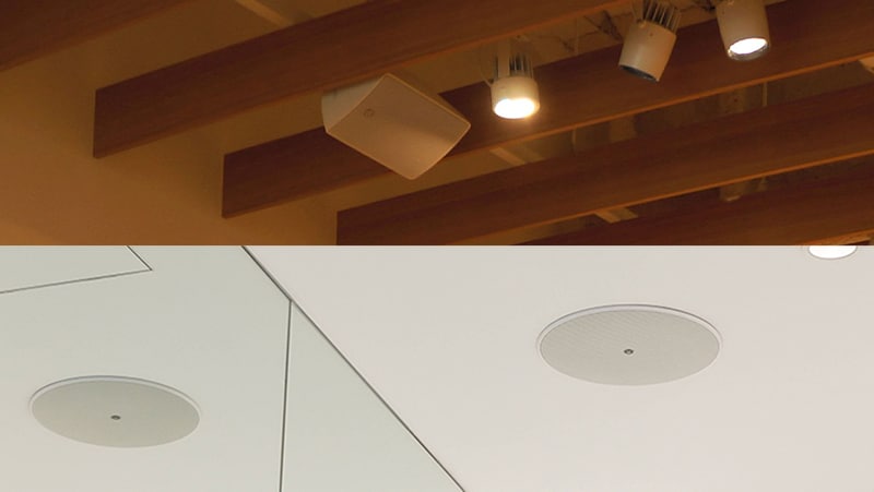 Two types of speakers, in-ceiling speakers and surface-mount speakers, which are mounted onto the wall or ceiling, are typically used to maximize the effectiveness of stores and other commercial spaces or service spaces. It is difficult to install residential speakers in a manner that satisfies commercial requirements. In general, in-ceiling speakers are used to make the presence of speakers less noticeable, and surface-mount speakers are used for sites with no ceiling panels or to make the speakers a more prominent part of the interior design. For stores with low ceilings, we recommend using surface-mount speakers, which are easier to aim at specific areas targeted for delivering sound. For stores with high ceilings, pendant type speakers, which are hung down from the ceiling, may also be suitable. When selecting speakers, also consider installation site restrictions, for example, and models that satisfy your own design preferences or building requirements.