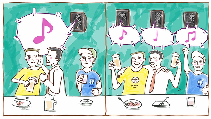 In bustling stores, there is a tendency to increase music volume in an attempt to energize the atmosphere. However, if there are too few speakers for a given space size, the increased volume emitted per speaker can sound annoyingly noisy, rather than energizing, making the space less comfortable. In such cases, we recommend increasing the number of speakers, so that the volume for each speaker can be decreased to achieve a more balanced sound.
