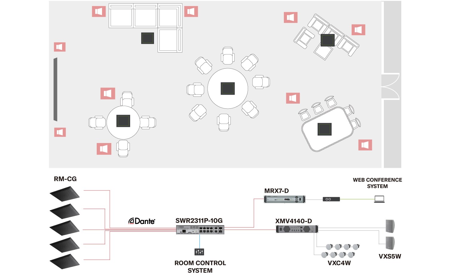 Pokud chcete variabilně využít velkou místnost, je nejlepší volbou řešení na míru, které kombinuje 5 stropních mikrofonů RM-CG s matrix procesorem MRX7-D a zesilovačem XMV-4140D a vytváří tak velmi variabilní řešení.