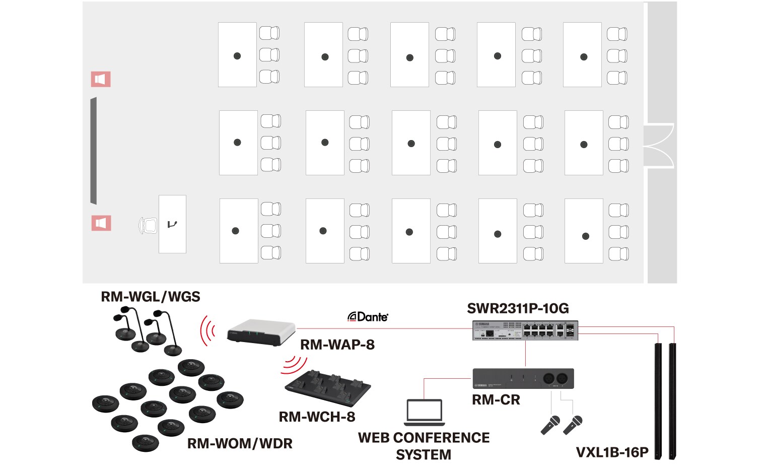 Vzhledem k tomu, že konferenční sály jsou různě uspořádány, někdy s velmi vysokými stropy nebo s různým uspořádáním sedadel, se stoly nebo bez nich, je zapotřebí flexibilní a snadno integrovatelné řešení. Pomocí bezdrátové technologie ADECIA Wireless lze připojit 16 bezdrátových mikrofonů a rozmístit je po stolech nebo u řečnického pultu. Kromě toho lze ke konferenčnímu procesoru RM-CR připojit další analogové mikrofony. Ozvučení pak zajišťují reproduktory VXL1-16P. Tímto způsobem lze konference vysílat kdekoli.
