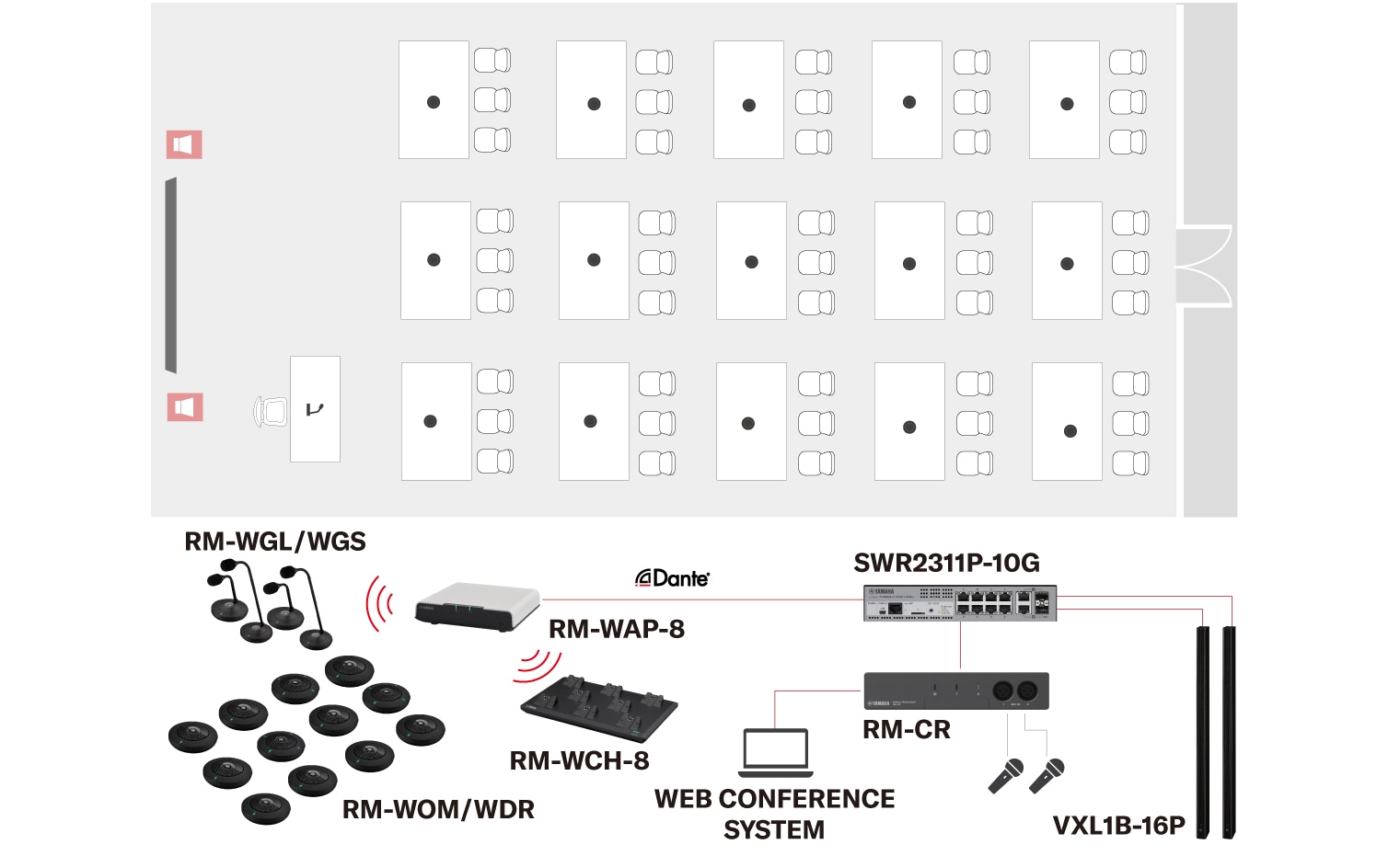 Stropní a nástěnné reproduktory poskytují dobrý zvuk pro vzdálené účastníky. Lze vytvořit jednotlivé zóny a technologie Yamaha pro zpracování zvuku zajišťují, že v místnosti nedochází k ozvěně ani dozvuku. Kromě toho lze prostřednictvím USB audio rozhraní připojit webový konferenční systém a zapojit tak do jednání nebo workshopů další účastníky.