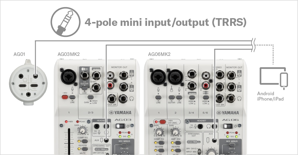 AG01 je nový model, který integruje kondenzátorový mikrofon studiové kvality s jednotkou vysoce výkonného mixu, která nabízí téměř shodné DSP efekty, funkci LOOPBACK a flexibilitu vstupů, jako AG06MK2 a AG03MK2 pro bezstarostné streamování. AG01 je dostatečně kompaktní, aby jej bylo možné umístit na stůl nebo namontovat na rameno připevněné ke stolu a proměnit tak téměř jakékoli prostředí na minimalistickou streamovací stanici. Lze jej napájet z mobilní baterie, díky čemuž si můžete plně funkční streamovací stanici vzít s sebou kamkoli chcete.