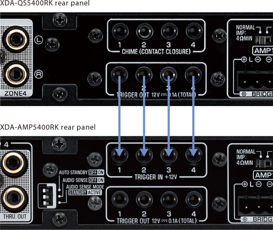 When a QS and AMP are used together, simply wire the trigger ports to automatically power on/off the desired amplifier zones – no additional control interface is needed. The AMP also works great as a companion to an AVENTAGE AV receiver. When using the AMP with other sources, audio sensing inputs and an infrared I/O provide additional control flexibility.