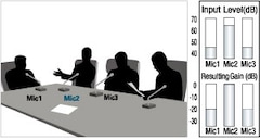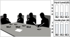 The Dugan-MY16 uses the innovative Dugan Speech System™ to control gain, distributing microphone gain across the entire system in order to retain the natural ambience of a single microphone.This remarkable system achieves automatic mixing without distracting level changes, inconsistent ambience, or other problems associated with automatic mixing using noise gates.The illustration shows the input and gain levels for three microphone inputs.