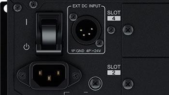 In addition to the main AC IN connector, an external +24V DC power source can be connected to an XLR-4-32 type EXT DC INPUT connector to serve as a backup for the primary internal power supply. The main AC input also features a latched socket (V-Lock) that helps to prevent accidental disconnection.