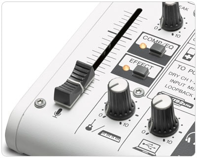 Model AG03 je vybaven knoby ovládání hlasitosti a 60mm faderem na předním panelu pro jednoduché manuální ovládání vašeho hlasu, podkresové hudby a dalšího audio obsahu nebo zvukových efektů.