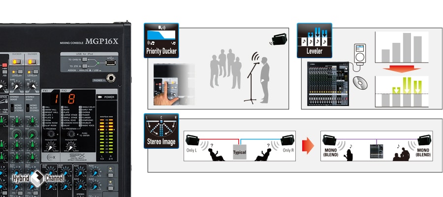 40 let zkušeností při výrobě profesionálních mixů přimělo Yamahu nabídnout nový způsob, jak přistupovat ke zvuku v digitálním věku: Stereo hybridní kanál. Pod knoflíky a enkodéry analogového stylu u MGP série mixážních pultů se nachází sofistikovaný digitální ovládací systém — spojení, které kombinuje tradiční analogový pocit s funkčností, kterou může nabídnout pouze digitální technologie. Řada MGP využívá výkonný, patentovaný DSP procesor, který poskytuje tři základní funkce, které jsou základem instalovaných i živých zvukových aplikací. V souladu s myšlenkou analogové jednoduchosti obsažené v designu řady MGP je každá z těchto funkcí snadno přístupná a dostupná pouhým stisknutím tlačítka. Stereo hybridní kanál vybavený třípásmovým EQ s parametrickými středy pro jemné doladění zvuku a vysoce výkonnými vestavěnými A/D a D/A převodníky nabízí unikátní funkčnost a vynikající zvuk.