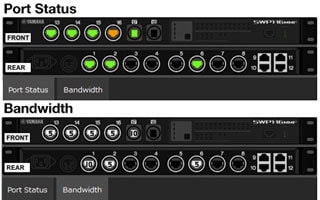 Monitor LAN Yamaha obsahuje zobrazení stavu portů a šířky pásma, které jasně ukazuje stav připojení každého portu síťového přepínače, informace o připojených zařízeních, rychlost komunikace na každém portu a využití šířky pásma na každém portu.