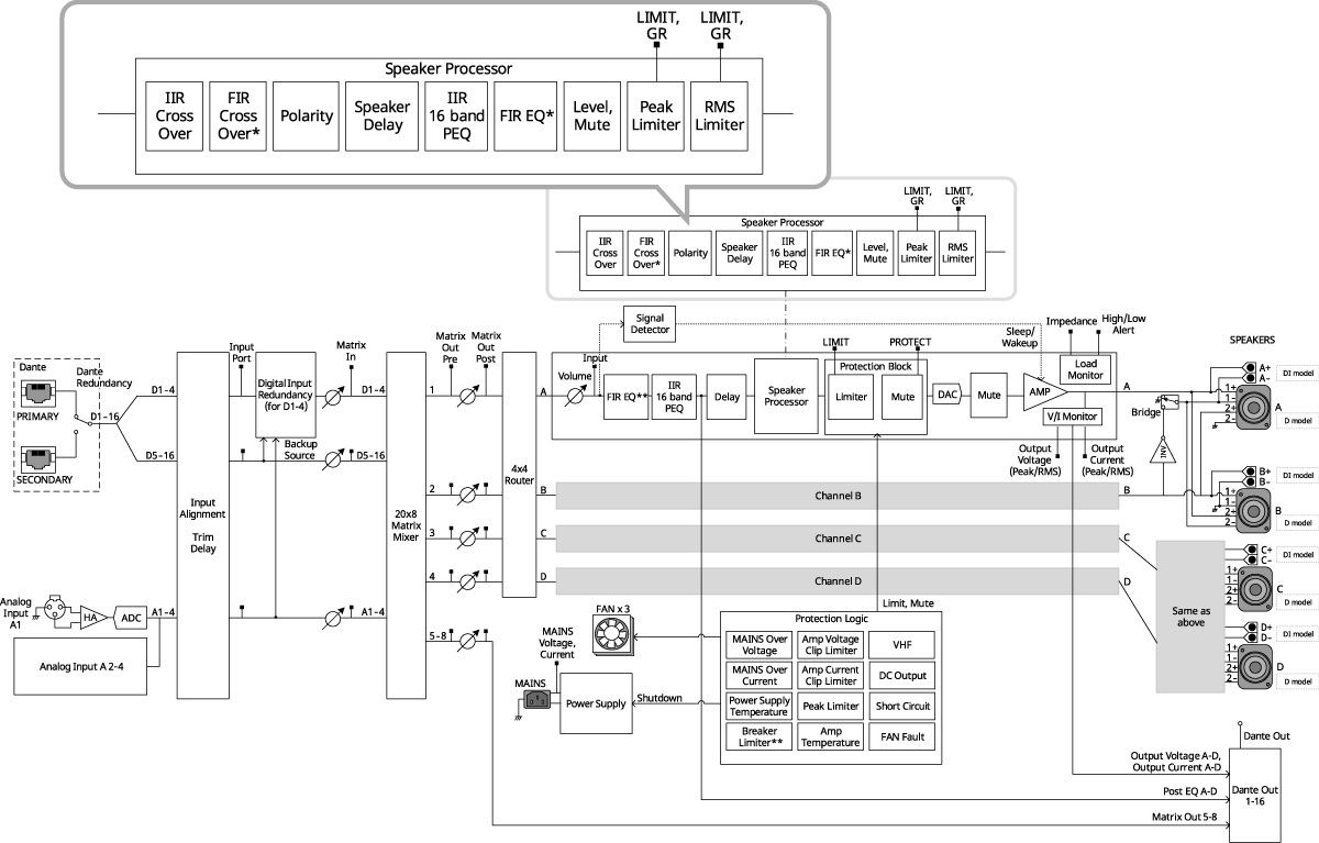 - Speaker processor such as 16 band PEQ, crossover, filters, delay and limiter