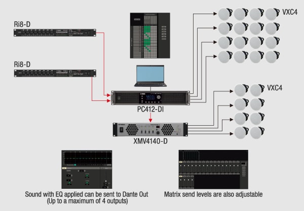Sound is fed from Dante inputs on two devices to a PC412-DI. Input matrix functionality is used to direct the combined sound to speakers. Additionally, Dante Out can be used to send sound with adjusted EQ to other amlifiers.