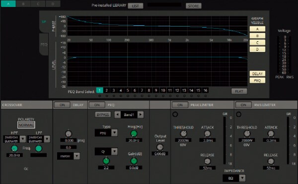 - Speaker processor such as 16 band PEQ, crossover, filters, delay and limiter