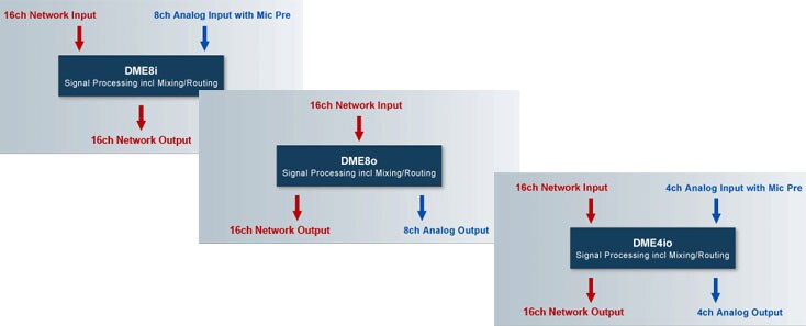 All three models in each series include a 16-in/16-out CobraNet™ or EtherSound interface. The DME8i and DME4io analog inputs feature remotely controllable microphone preamplifiers. Whether it's a minimal system based on the DME4io, a delay tower distribution system using DME8io units directly fed from the mixer, or a large scale system based on DME64N or DME24N Digital Mixing Engines with DME Satellite units used for distributed I/O and minimal processing, the DME Satellite series offer scalable solutions that make setup fast, flexible, and reliable. Of course you can also combine the DME4io with DME8i or DME8o units to create 12-in/4-out or 4-in/12-out configurations as required.