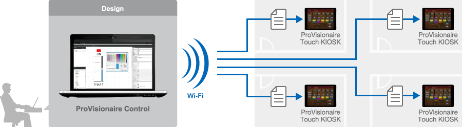 Controller screens for the "ProVisionaire Touch KIOSK" iPad application have until now been designed using "ProVisionaire Touch," but this update allows them to be designed using "ProVisionaire Control" PC software and sent directly via Wi-Fi. The controller design interoperability this provides is advantageous when you need to efficiently create large numbers of controllers.