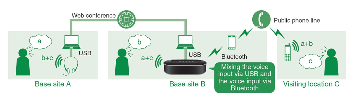 The audio mixing function mixes multiple voice input sources connected to each interface (USB, Bluetooth, and audio input/output) allowing simultaneous communication over different lines. For example, while connected to a web conference via USB, you can also include more participants via smartphone using a Bluetooth connection by using the audio mixing function to combine the audio sources.