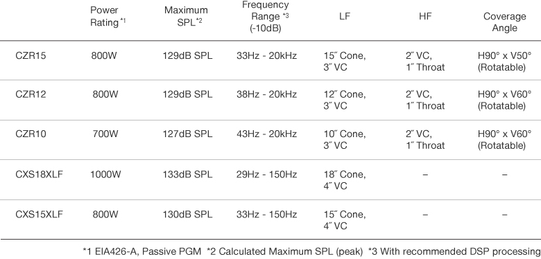 CZR série je řada pasivních reproboxů s vysokým výkonem a špičkovým zvukem v lehkém, avšak robustním provedení. Díky své všestranné a kompaktní konstrukci skříně je lehký model CZR15 ideální pro řadu živých vystoupení a instalovaných zvukových aplikací – od živých kapel na venkovních festivalech až po DJe v klubech – tyto reproboxy poskytují křišťálově čistý a vysoce kvalitní zvuk s působivým podáním i nižších frekvencí. Pro rozšíření zvukových možností vašeho systému i ve velmi hlubokých basových frekvencích jsou zde pasivní subwoofery série CXS XLF, které dokáží posunout hranici přenášených nízkých kmitočtů až na překvapujících 29Hz pro pulzující reprodukci v nízkých frekvencích, která jistě zapůsobí.