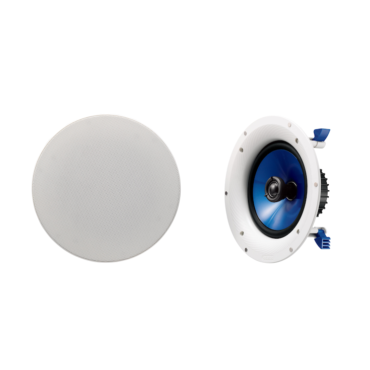An 8" coaxial ceiling speaker with cone woofer, fluid-cooled soft-dome swivel tweeter, 140W power handling, horn-shaped acoustic baffle and thin, light grille with magnets