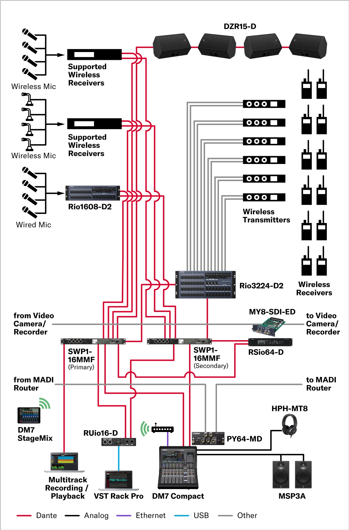 This is a system for recording and broadcasting live performances in a network studio. The DM7 Compact is compact but capable of mixing 72 channels. The optional Broadcast Package software allows you to use Mix Minus functionality, and to monitor with a loudness meter.