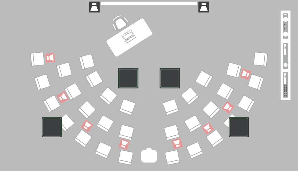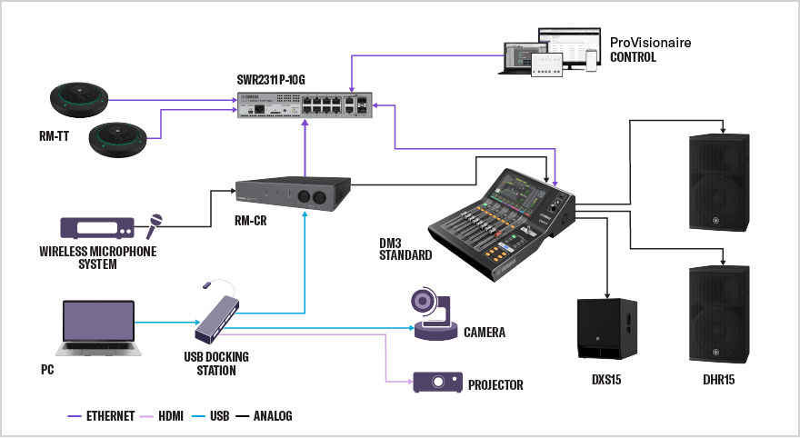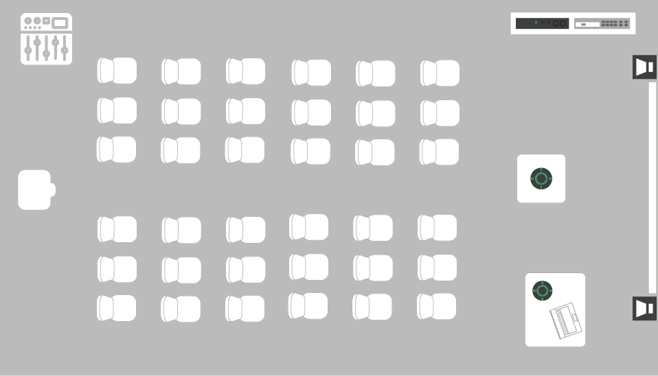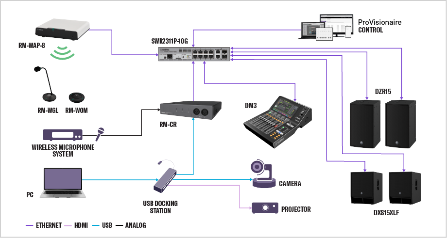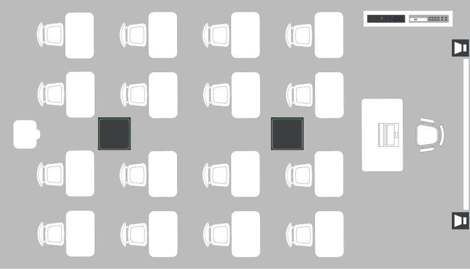 A larger space calls for a flexible and expandable system - all the tools that you need to create a custom solution for any size of venue. Here we have combined the ADECIA solution with the DM3 audio mixer, and some simple automation. The use of Dante networked audio means that it's incredibly easy to reconfigure your system for different events - or to scale up to include additional speakers or microphones. The speaker system provides you with room-filling sound, whether you're making a presentation, playing media, or presenting a live performance of music or theatre.