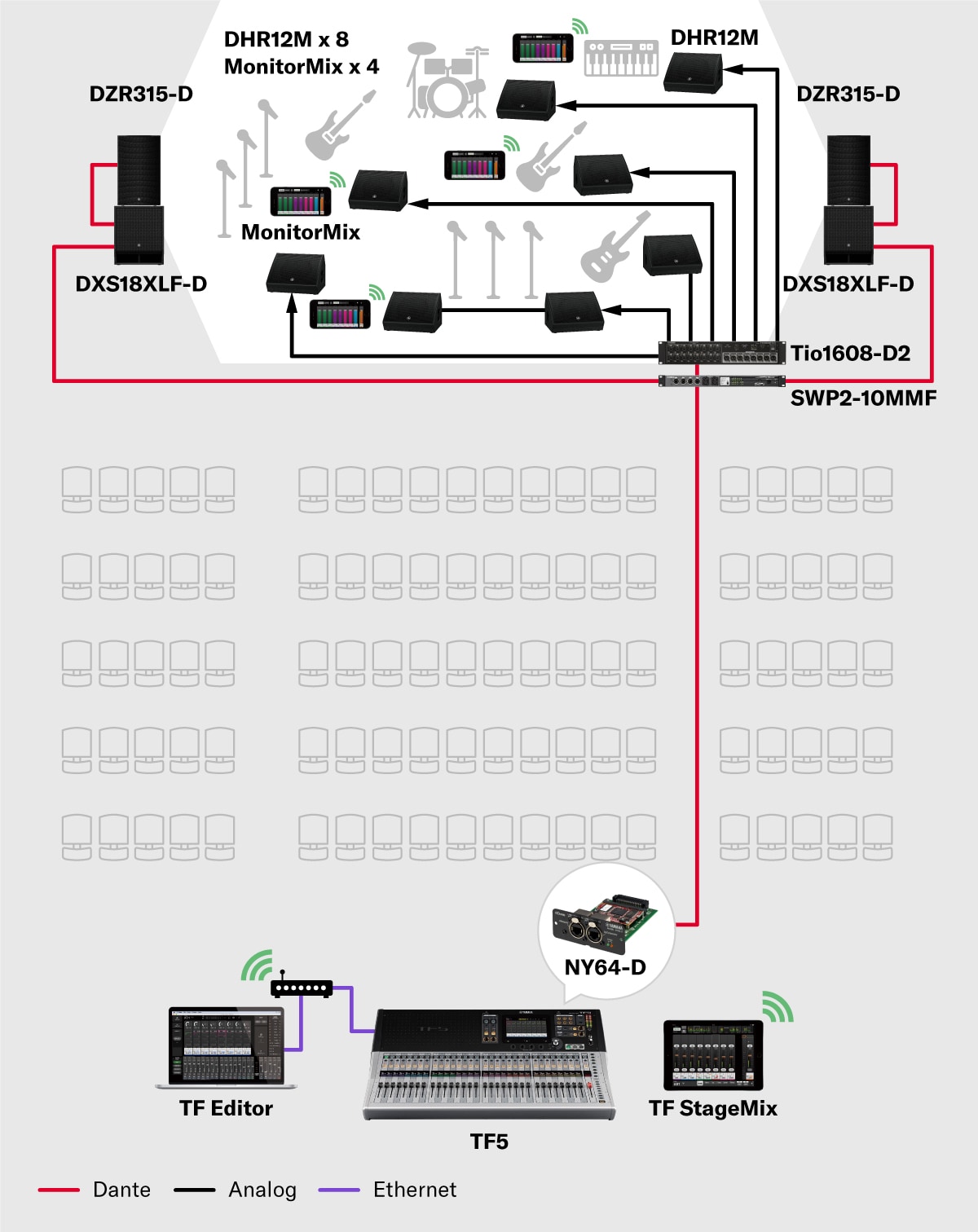 This is a solution for small to medium-sized churches that would feature a variety of performance applications. The system is centered around a TF5 mixing console, combined with DZR loudspeakers which come equipped with flexible functions to hone their high output power, as well as QuickPro Presets to aid operators in dialing in their ideal sound. As a Dante-enabled system, it requires a minimum of configuration and installation time as multiple channels can be routed via a single lightweight Ethernet cable. Dante also allows for more convenient redundant connectivity, greatly improving system reliability for a worry-free operating experience.