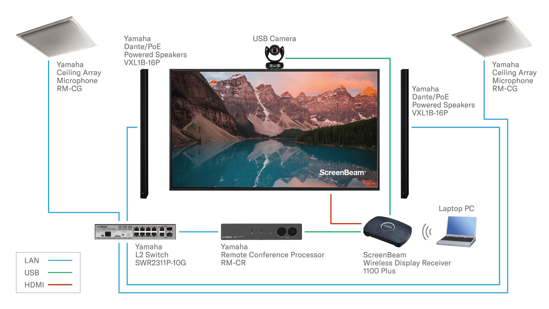 ScreenBeam 1100 Plus, combined with Yamaha’s ADECIA Microphone and Speaker solution and a supported USB camera, brings a premium video and audio conferencing experience to any hybrid learning or work environment with rich content sharing.