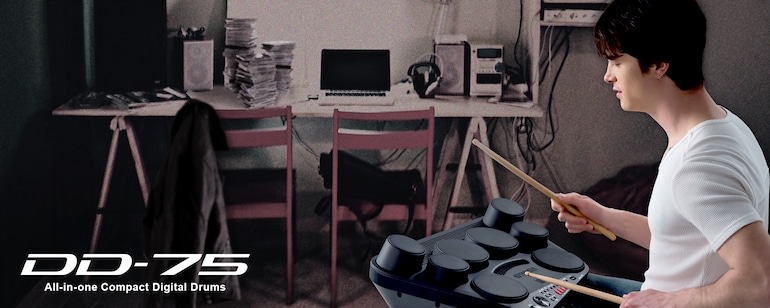 DD-75 jsou digitální bicí s osmi dynamickými pady a dvěma pedály. Vysoce kvalitní bicí zvuky a široká škála perkusních zvuků z celého světa jsou míchány s orechestrálními zvuky, což vám poskytuje širokou škálu hudebních možností. Do portu AUX IN můžete připojit například MP3 přehrávač a hrát si společně s hudebním podkladem v MP3.