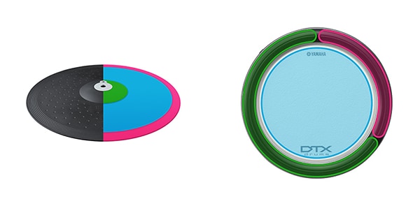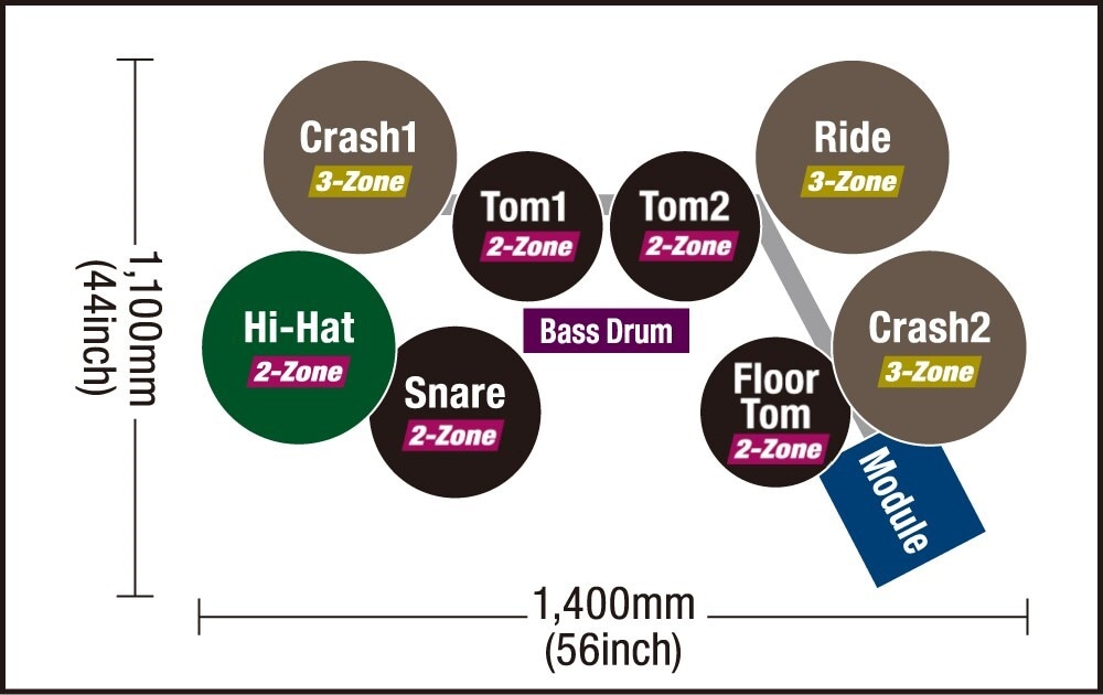 - 3-zone pads for the crash, and ride. The cymbals can be choked and muted. The ride cymbal is equipped with a hit point detection function (positional sensing)