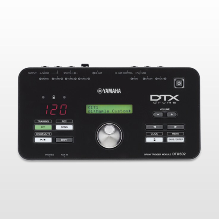 While the outside retains the familiar layout of the DTX500, inside the new DTX502 drum trigger module beats a brand new heart. We took the most popular Yamaha drum sounds and made them even better, and then we added 250 new voices including drum and cymbal sounds licensed from top VST developers that have been optimized for DTX. We also fine-tuned the trigger settings on this module and made them easy-to-use so that pads and triggers offer more expression than ever before. With expanded training functions you can become a better drummer, and with the wave-import feature you can add your own new sounds. The module accepts up to 12 trigger signals and our new design allows easy integration into an acoustic/electronic hybrid setup.