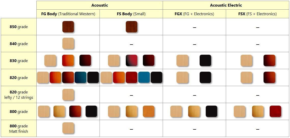 Dva tvary těla, včetně zcela nového tvaru FS v koncertní velikosti; 5 úrovní s různými typy dřev; množství barevných variant; akustické nebo elektroakustické modely. Ať již má vaše hudba jakoukoliv osobitost, vždy najdete vhodný model FG.