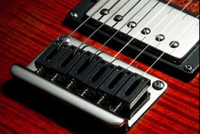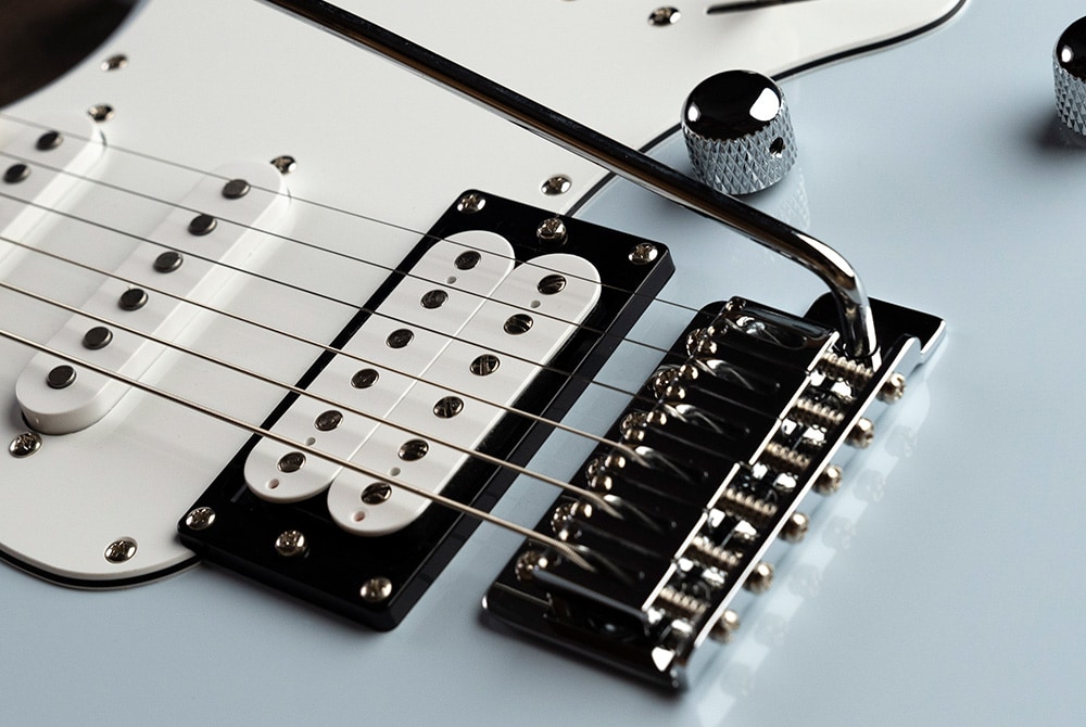 Uzamykatelná ladící mechanika Gotoh v kombinaci s 2bodovou tremolovou kobylkou Gotoh zajišťují hladký chod a výjimečnou stabilitu výšky tónu. Obrázek - Gotoh uzamykatelná ladící mechanika na zadní straně hlavy a Gotoh dvoubodové tremolo.