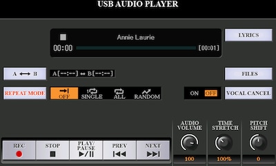 Ať už chcete obohatit svá živá vystoupení o doprovodné stopy z vaší hudební knihovny, nebo chcete jen oživit party o nějaké karaoke, tak pak jsou vám k dispozici pokročilé funkce USB audio přehrávače, jako je time stretch (změna tempa audio souboru bez změny ladění), pitch shift (transpozice audio souboru bez změny tempa), vocal cancel (potlačení hlavního vokálu v audio souboru) a zobrazování textů MP3 souborů s všestranným použitím na jakékoliv hudební akci.