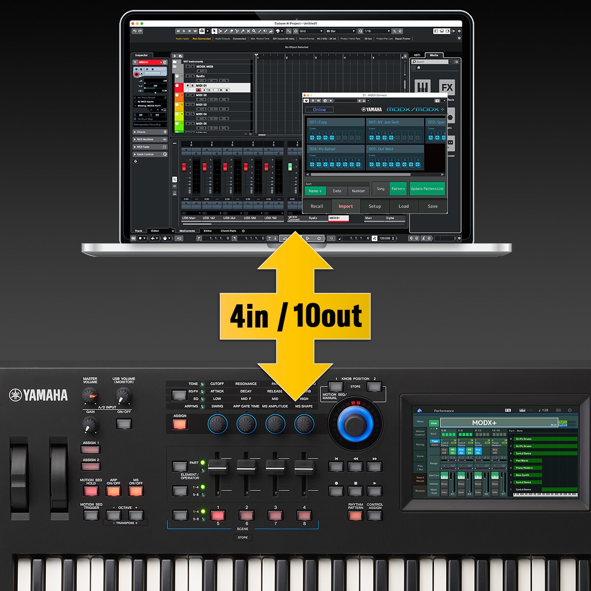 Jak se očekává od moderní hudební produkční stanice založené na počítačích, tak model MODX+ je vybaven profesionálním vícekanálovým USB audio rozhraním se 4 vstupy/10 výstupy. Ve spojení se dvěma A/D vstupy je MODX+ dokonalým centrem pro libovolné profesionální nahrávací studio nebo počítačový systém pro živé hraní.