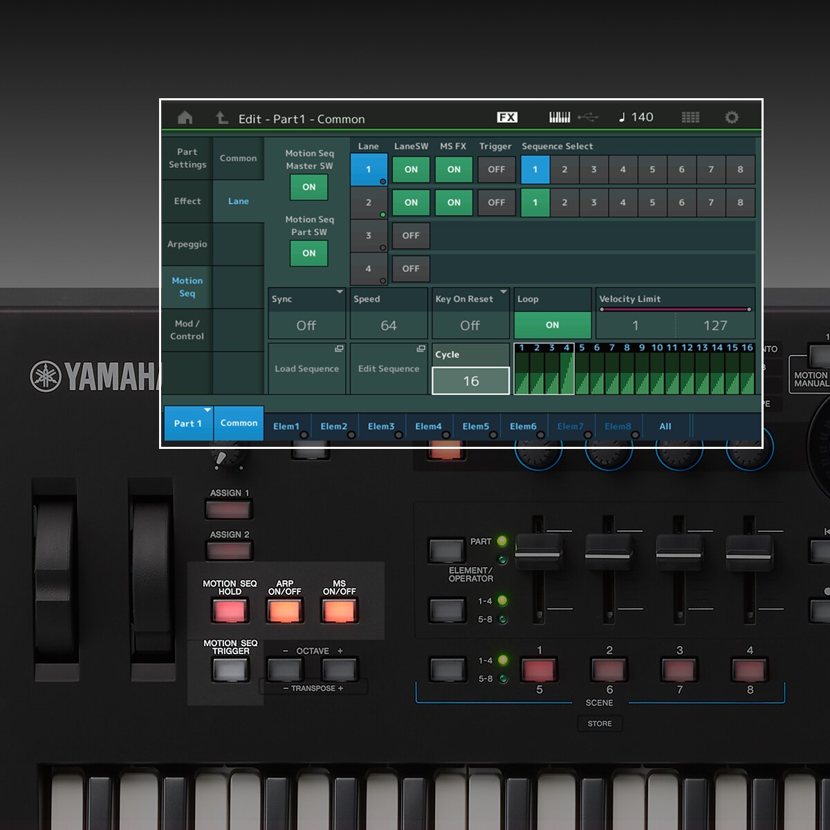 Pro Motion Sequences jsou na ovládacím panelu také vyhrazeny speciální ovladače, díky čemuž je změna parametrů a manipulace s nimi v reálném čase velice snadná a výsledkem je neuvěřitelná interaktivita a expresivita.
