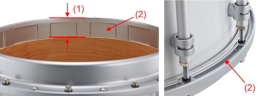 A larger radius at the top of the rim reduces damage to drumsticks when playing rimshots (when the head and rim are struck simultaneously). A thicker rim also increases durability while enhancing rimshot tone.