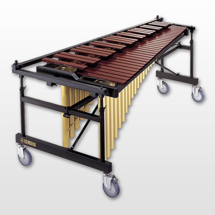 The YMRD-2400 is a 4 1/3 octave multi-frame marimba. The wide body design for lower bars enables superior tone and projection. The Acoustalon bars with sonic tone holes provide the most realistic sound to Rosewood with unparalleled durability and consistency in all types of weather. While the gas shock height adjustment capability is both smooth and convenient, the square reinforced frame maintains a sleek, modern look. Durability has not been compromised as the 6" wheels make pushing the marimba over grass, turf or gravel easy.
